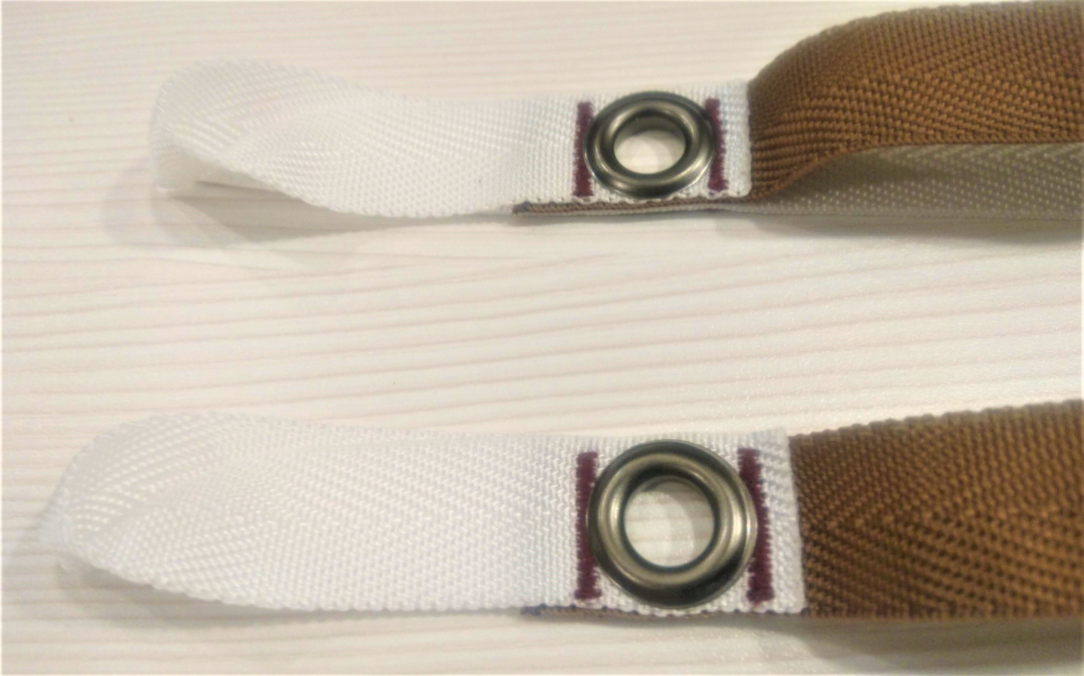 ●材質:テープ=ポリプロピレン、バックル&クリップ=プラスチック、ハトメ=真鍮(黒ニッケル、穴径10mm)
